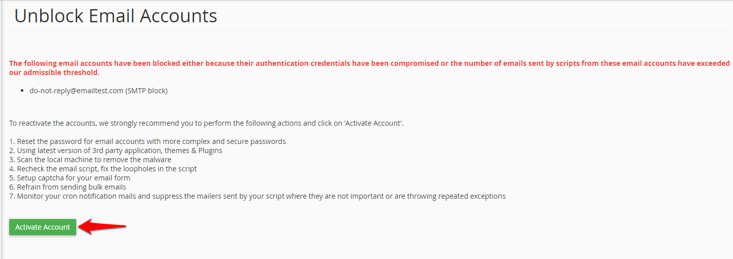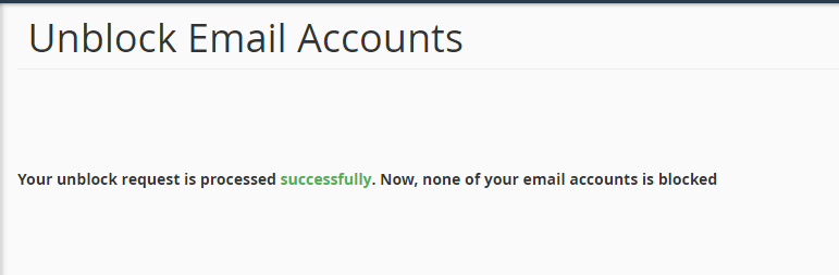• The below message will appear in your cPanel interface once the accounts are successfully unblocked.