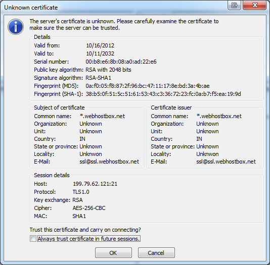 Select the Always trust certificate in future sessions. option and then click the OK button.