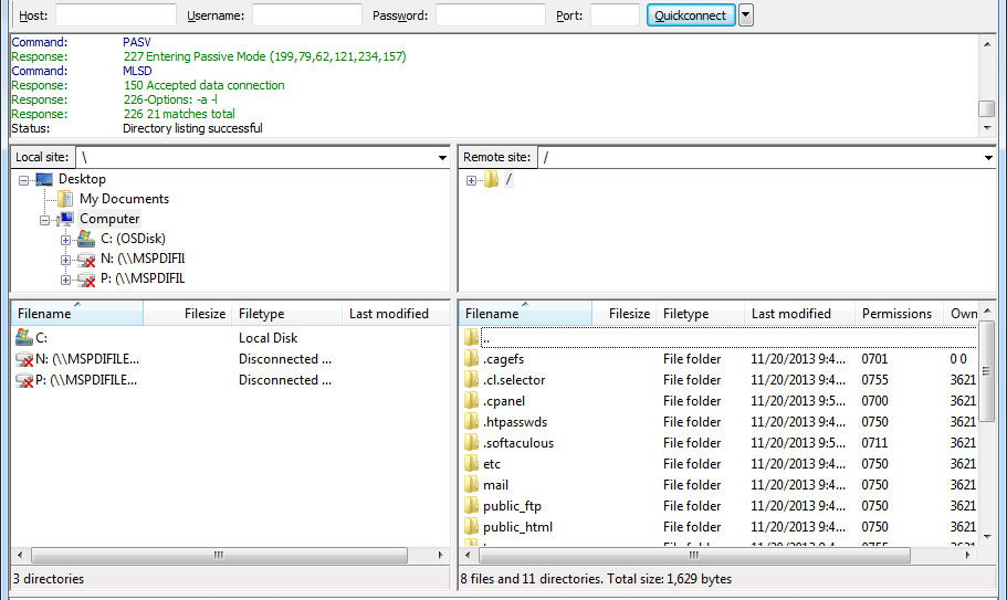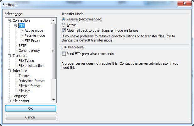 Select yourdomainname.com and click the Transfer settings tab. Here, you can change the data connection mode to Active or Passive.