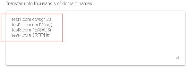 • Domain Information: Enter each domain name on a separate line. Mention their respective Transfer Secret/Authorization Code on the same line as the domain name, separated with a comma.