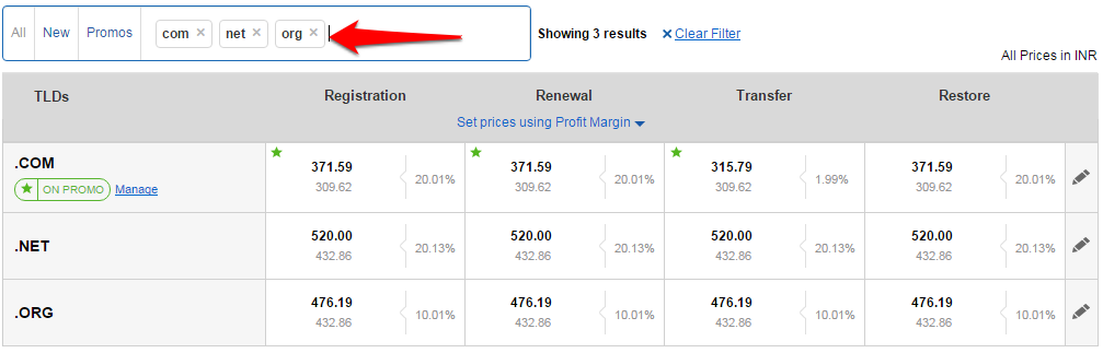 - Search and Bulk update prices for a set of TLDs using the profit-based pricing tool