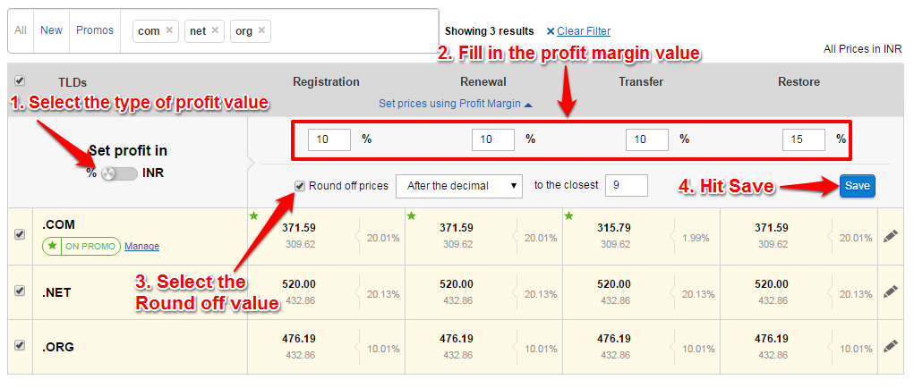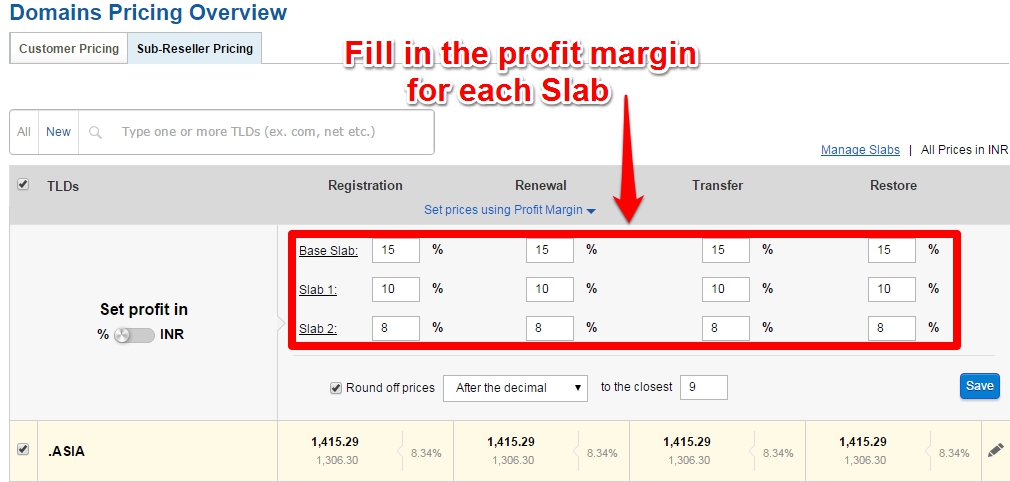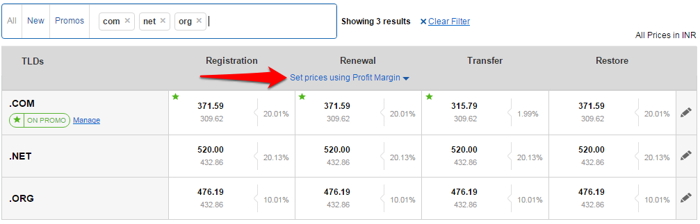 With the bulk pricing tool, you can do a bulk search for the TLDs, specify your profit margin and the system will calculate and set your selling prices accordingly for all Slabs.