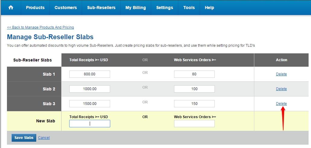 You may set Pricing Slabs depending upon the Total Receipts of your Sub-Resellers or the number of Web Services (Email Hosting + Windows Web Hosting + Linux Web Hosting + Website Builder) Orders purchased by your Sub-Resellers. The Selling Price to each Sub-Reseller is determined at the time of purchase depending upon the Total Receipts, the number of Web Services (Email Hosting + Windows Web Hosting + Linux Web Hosting + Website Builder) Orders, your Slab Pricing and the Sub-Resellers' Specific Pricing.